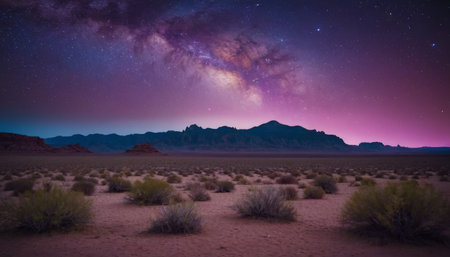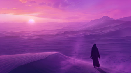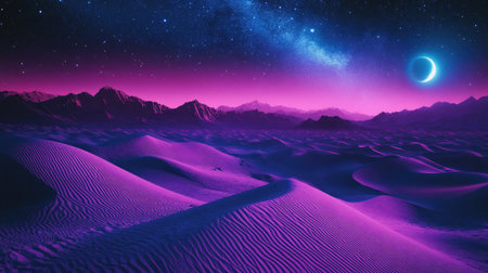 Stunning, digitally altered image showcasing a desert landscape with vibrant purple hues, contrasting against a night sky filled with stars and a crescent moon. The dunes and mountains are outlined in dramatic lighting, and the textures of the sands and rock formations are clearly visible. The overall composition evokes a sense of awe and wonder.