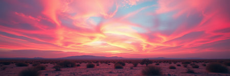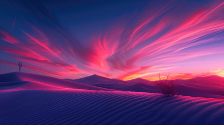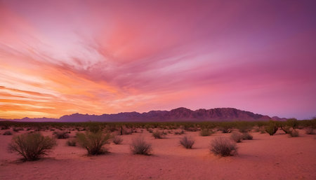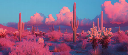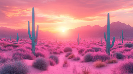 Vibrant desert landscape at sunset with pink hues and tall cactus plants under a colorful sky. Serene nature and tranquility concept
