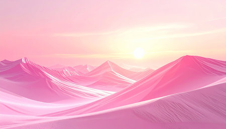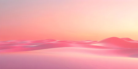 A serene, minimalist desert landscape at dusk with a soft gradient of pink and orange hues melting into each other.