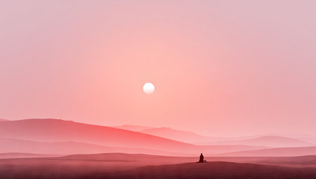 Serene landscape at sunrise, featuring a solitary figure seated on a gently undulating plain, the colors of the scene are soft pinks and warm tones, giving a sense of peace and quiet. The lines of the landscape are smooth and simple, and the soft, muted tones create a peaceful atmosphere.