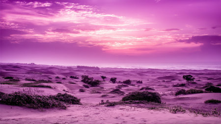 A stunning sunset showcases a vibrant pink and purple sky dominating the landscape. Soft clouds and gentle lighting create a tranquil atmosphere. The image depicts rolling sand dunes, potentially suitable for travel or environmental publications. The scene may serve various commercial or artistic applications.