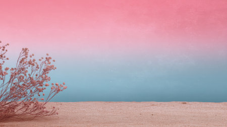 This artistic landscape features a soft pastel pink and blue gradient sky, highlighting delicate dried plants against a sandy surface, creating a serene composition.