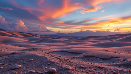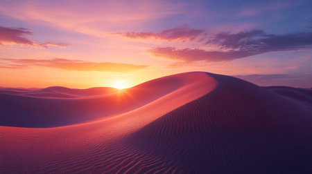 Rolling dunes stretch for miles in this stunning desert landscape, reflecting shades of purple and pink as the sun sets on the horizon