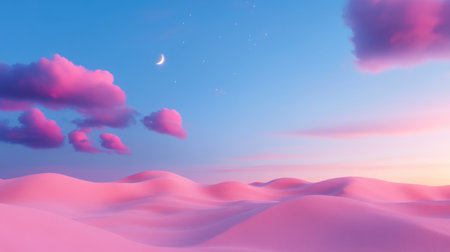 A surreal and ethereal landscape featuring soft pink dunes under a twilight sky, adorned with fluffy, vibrant pink and purple clouds and a delicate crescent moon.