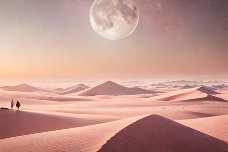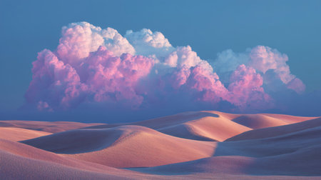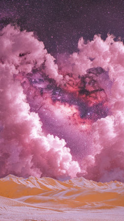 An ethereal scene displays fluffy pink clouds against a backdrop of a starry night sky. The composition includes a foreground of golden sand dunes, suggesting a desert environment. The image uses soft lighting and a dreamy aesthetic suitable for various design projects and visual storytelling. It may be used for editorial and commercial purposes.