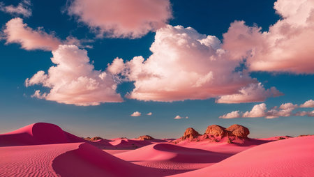 AI Generated. Pink desert landscape with blue sky and white clouds
