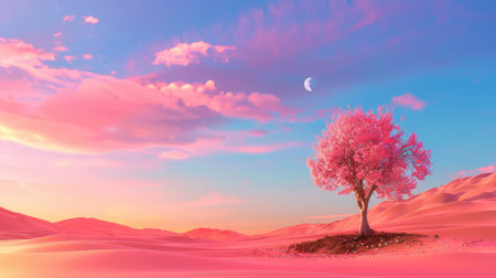 A stunning solitary pink tree stands majestically in a tranquil desert landscape, embraced by soft pastel skies at sunset and a crescent moon in the background.