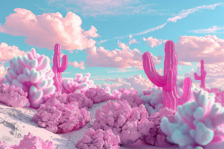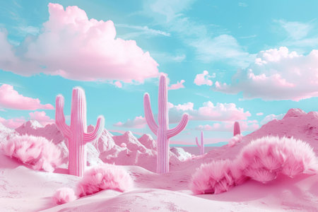 Surreal pink desert landscape featuring tall cacti under a bright blue sky with fluffy clouds Dreamlike and vibrant atmosphere creates a whimsical scene