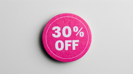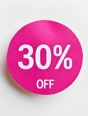 White '30% OFF' Text on a Magenta Round Paper Note. White Background