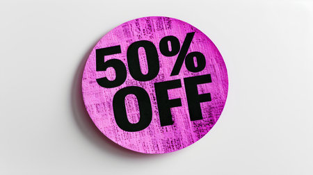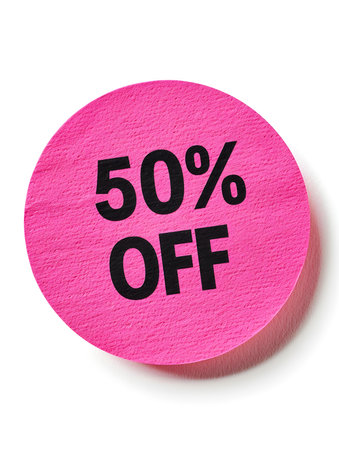 Black '50% OFF' Text on a Magenta Round Paper Note. White background with copy space