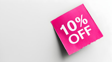 White '10% OFF' Text on a Magenta Square Paper Note. White background with copy space