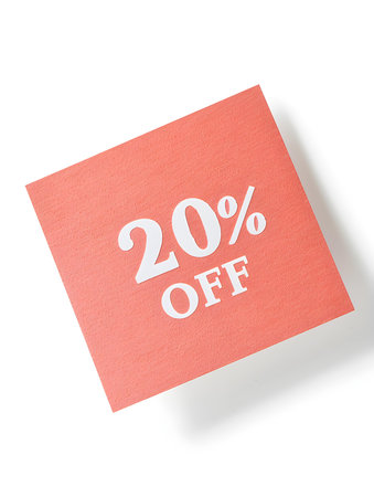 White '20% OFF' Text on a Light Red Square Paper Note. White Background