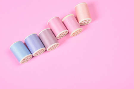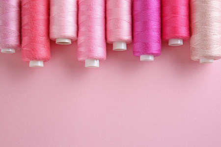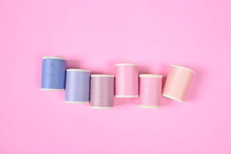 Flat lay of colored thread rolls for sewing on pink background, Sewing and needlework concept.