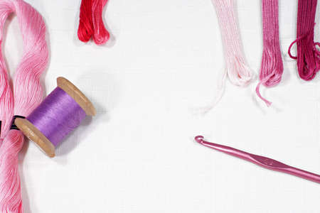 Silk threads for embroidery on a beige background. Skins of pink and lilac color. handmade concept. copyspace.