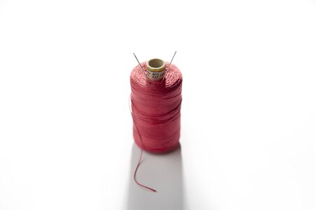 Sewing thread on white and red color,isolated on color background