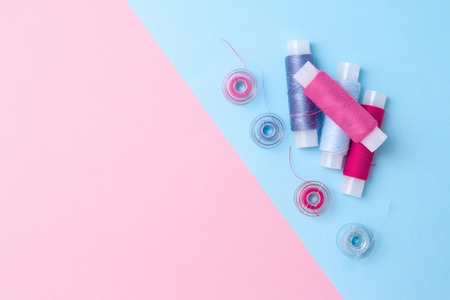 Multicolored thread coils on pink blue background. Sewing supplies and accessories for needlework, stitching, embroidery. space for text. flat lay, top view