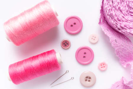 Sewing accessories and supplies at white background. Creative tailor concept