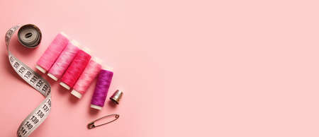 Colorful sewing threads and measuring tape on pink background with space for text