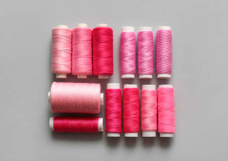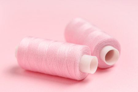 Spools of thread on pink background, closeup