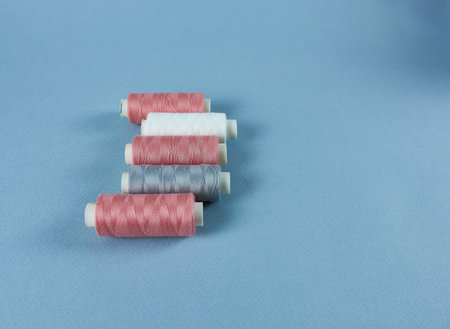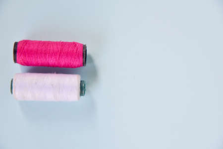 Thread pink, gray and white on a blue background in close-up.