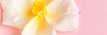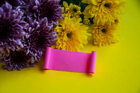 Beautiful purple and yellow color flowers and petals with blank torn pink paper on yellow background. Copy space.