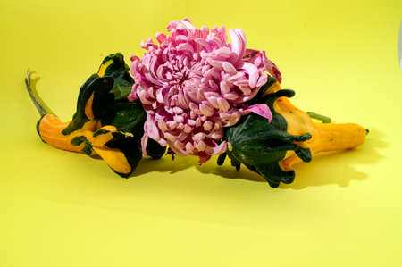 decorative pumpkins multicolored plant close up with chrysanthemum close up