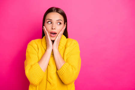 Portrait of astonished girl looking screaming touching her face wearing knitted sweater isolated over fuchsia background
