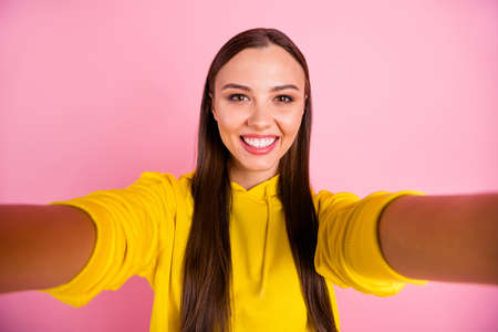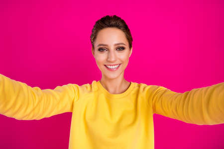 Photo of pretty adorable young lady wear yellow jumper smiling tacking selfie isolated pink color background