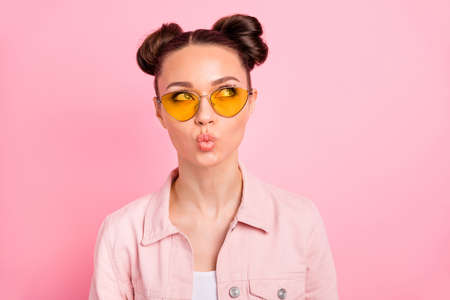 Close-up portrait of her she nice-looking attractive charming lovely, cute lovable winsome funny shine girl creating idea pout lips isolated over pink pastel background