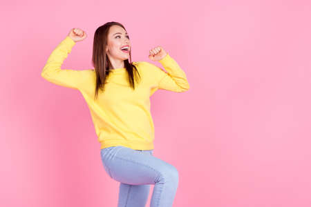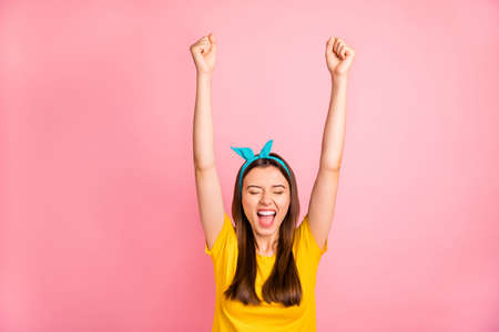 Portrait of thrilled teen with her, eyes closed raising fists screaming yeah wearing yellow t-shirt isolated over pink background