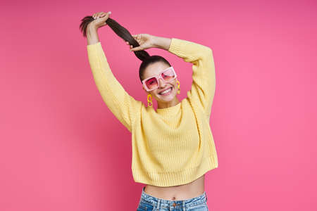 Happy young woman in funky glasses playing with her long hair against colored background