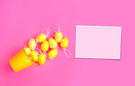 Concept sweet Easter symbols colored yellow eggs and buckets on pink paper background. Flat lay Top view with copy space for your text