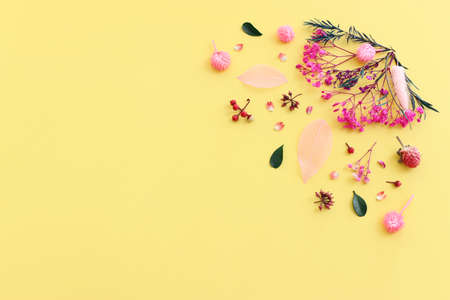 Top view image of pink, purple and green flowers composition over pastel yellow background .Flat lay