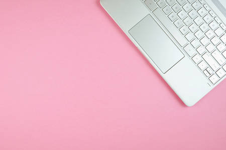 Pink background with modern touch screen laptop keyboard overhead with copy space.