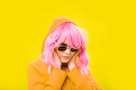Close up fashion portrait young beautiful woman in hoodie and glasses. Alternative funky girl with pink hair on yellow background. Unusual youth fashion concept. Hot image.