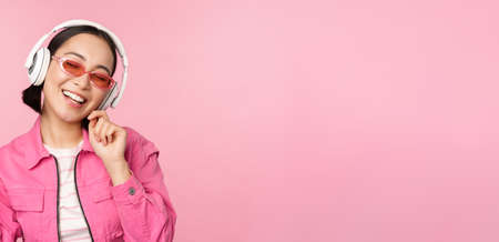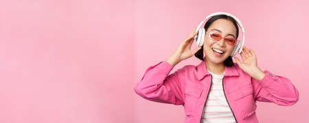 Dancing stylish asian girl listening music in headphones, posing against pink background
