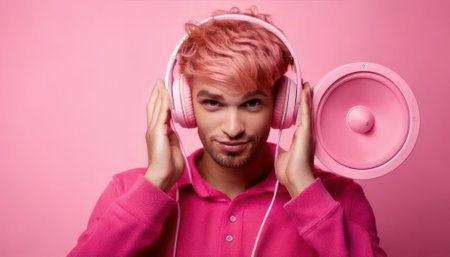 Young man with pink hair listening to music with headphones on pink background