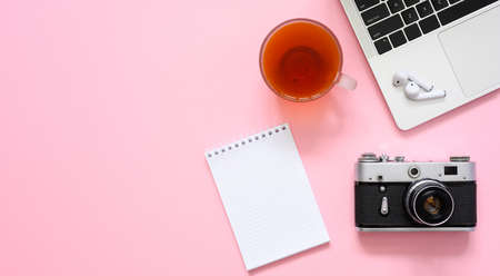 Notepad, cup of tea, laptop and vintage camera on a pink background. Workplace of a creative person. Flat lay, copy space.