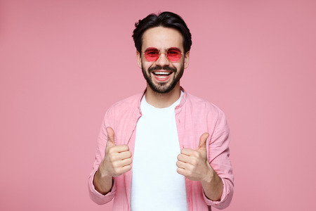 Handsome cheerful hipster with pink sunglasses smiling and showing thumb up gesture with both hands while standing on pink background and looking at camera. Joyful male in pink shirt laughing.