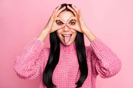Photo portrait of funny girl making glasses with fingers showing tongue isolated on pastel pink colored background