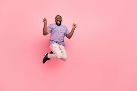 Full length body size view of attractive cheerful lucky guy jumping having fun isolated over pink pastel color background