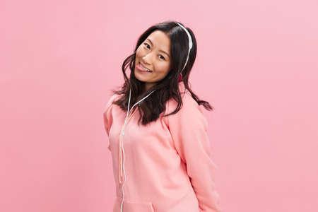 Lovely happy Asian student young lady in pink hoodie sweatshirt with cute headphones sticks tongue out posing isolated on over pink studio background. Good offer. Sound streaming platform ad concept