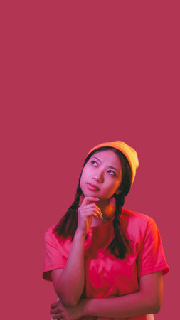 Idea inspiration. Advertising background. Neon light pensive brainstorming hipster woman thinking making choice isolated on pink empty space.
