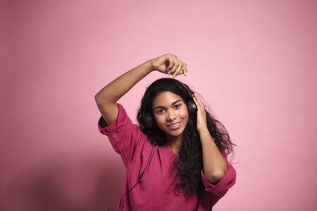 smiling woman listening music with closed eyes isolated on pink