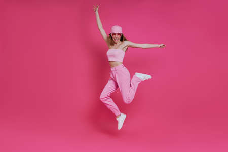 Full length of happy young woman in trendy clothing jumping against pink background