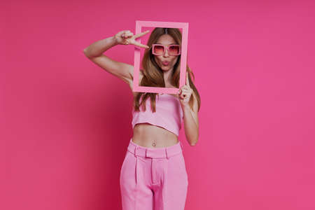 Playful young woman looking through a picture frame while standing against pink background