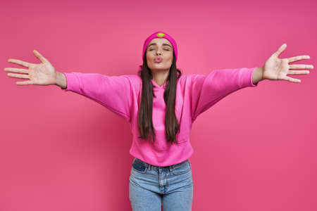 Beautiful woman in hooded shirt keeping arms outstretched and puckering against pink background