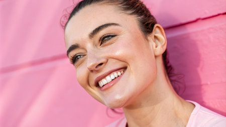 A close-up of a confident woman smiling, set against a soft pink backdrop, exuding self-assurance.