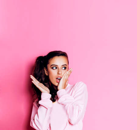 young pretty teenage girl emotional posing on pink background, fashion lifestyle people concept close up copyspace