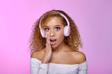 Shocked African American curly haired female listening to songs in headphones while expressing astonishment with opened mouth on gradient pink background in studio